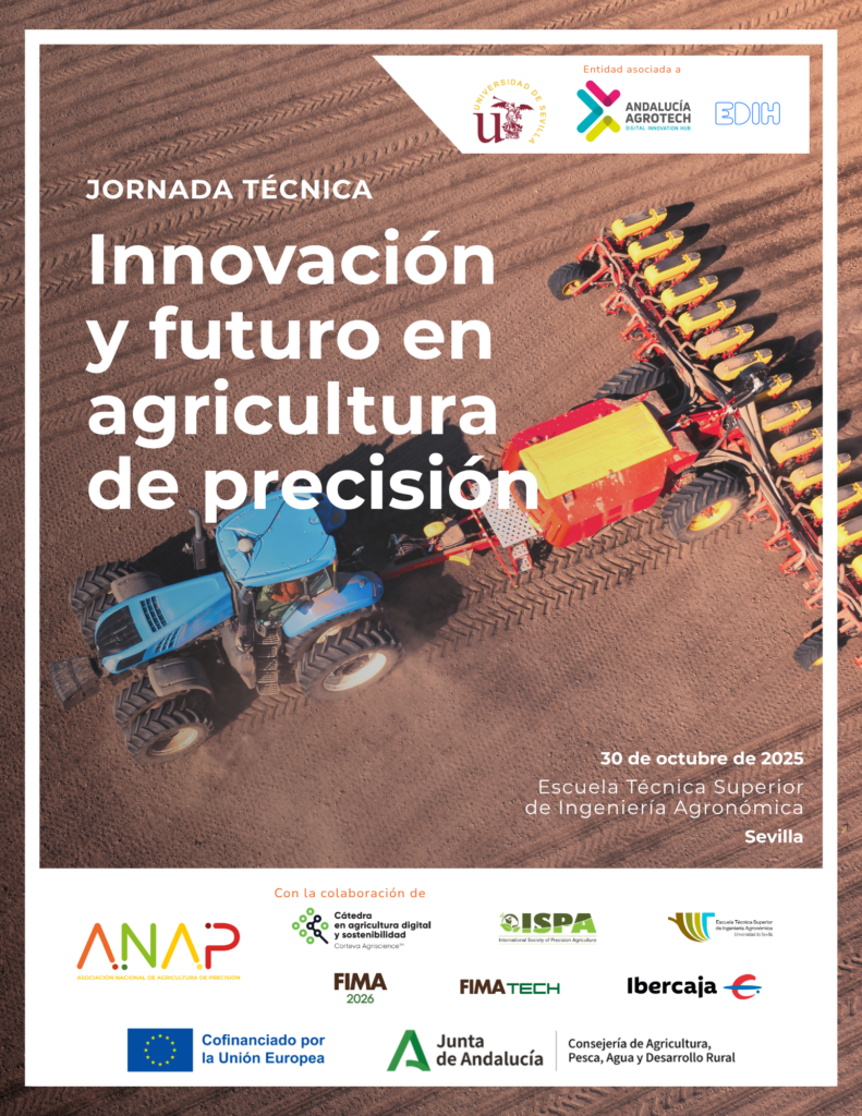La Universidad de Sevilla (en el marco del proyecto Andalucía Agrotech DIH) junto a la Asociación Nacional de Agricultura de Precisión, organiza el próximo 30 de octubre de 2025 la jornada técnica “Innovación y Futuro en Agricultura de Precisión”, que se celebrará en el nuevo salón de actos de la Escuela Técnica Superior de Ingeniería Agronómica de Sevilla.